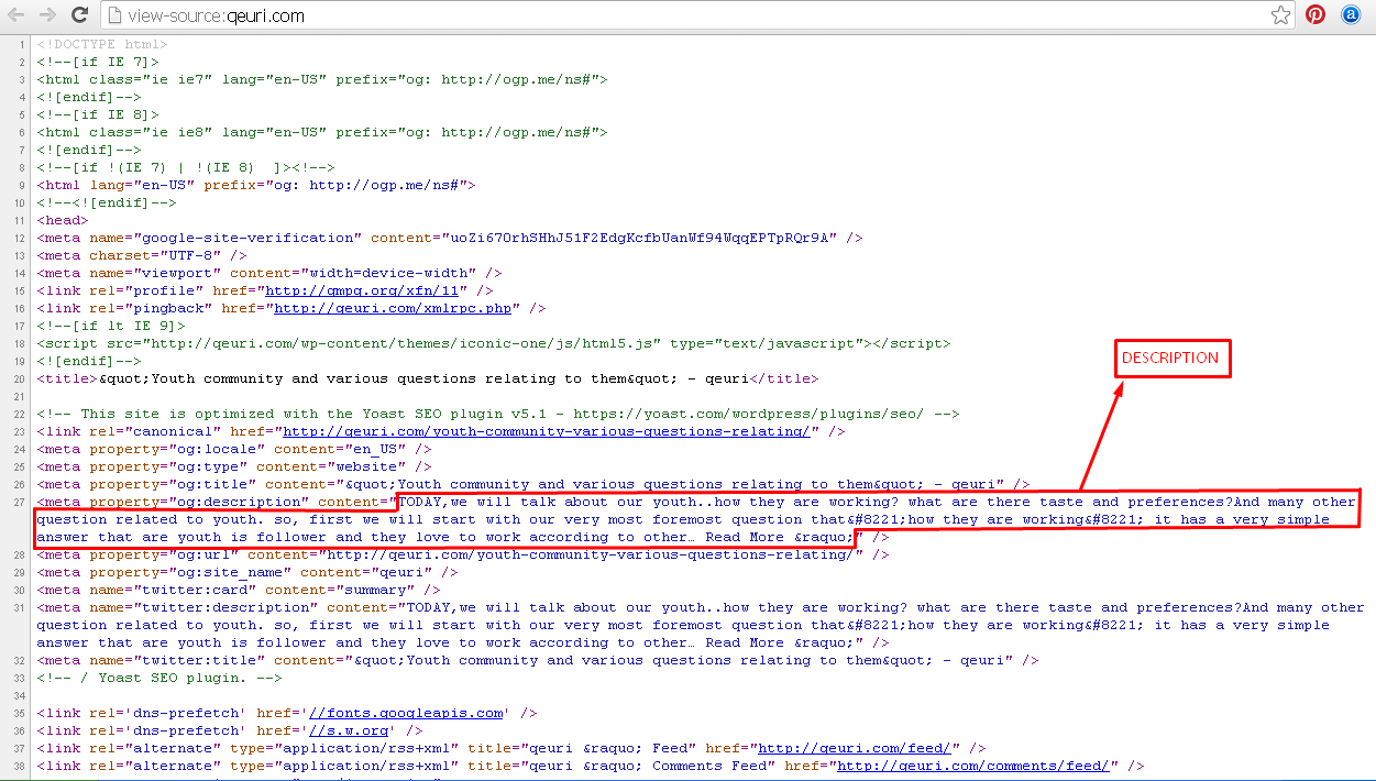 उदहारण के तौर पर हमने qeuri.com की listing करनी है और किसी भी Website का Title or Description देखने के लिए Website को Open करके Ctrl+U KeyPress करें तो उस Website का Source code open हो जाएगा, यह उस Website का Title है और यह Website की Description है|