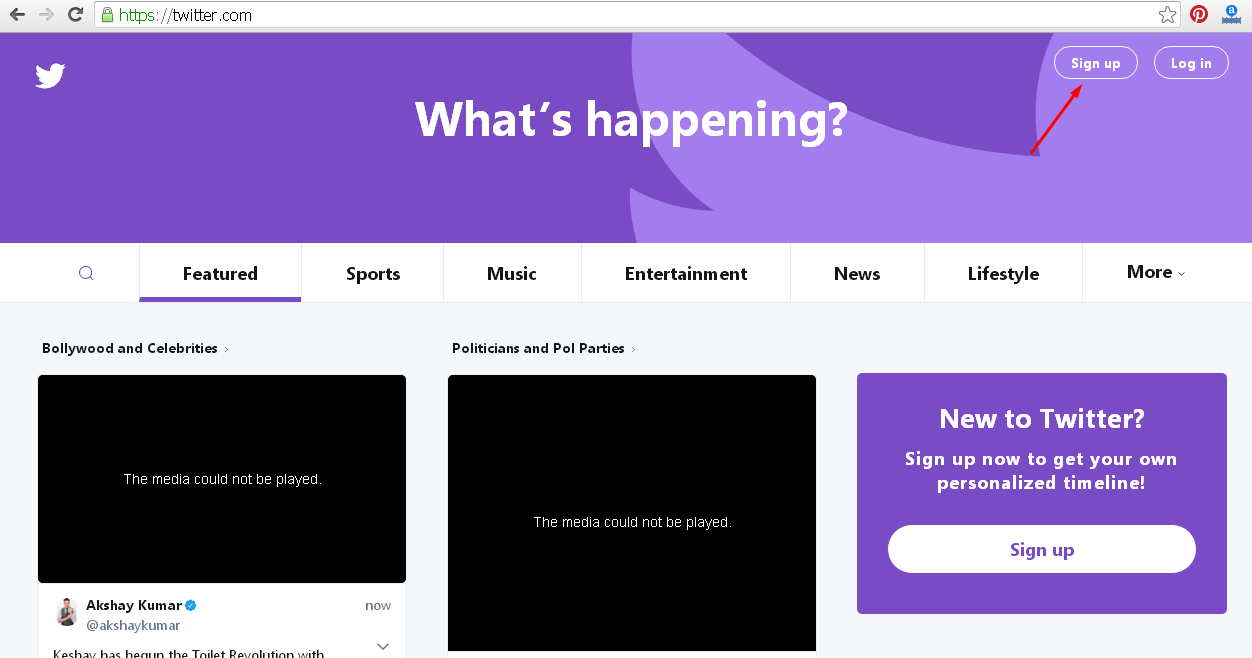 1.सबसे पहले यहां Google में Twitter.com Search करके Twitter की Site Open करें | फिर Twitter पर अपना Account बनाने के लिए Sign up पर Click करें |
