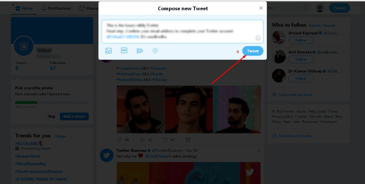 अगर आप किसी को Follow नही करना चाहते उसे Unselect करे | Then Follow & Continues पर Click करें, Then यहाँ Twitter का Home Page Open हो जायेगा, देखिये यहाँ Top पर Message Show हो रहा है कि सबसे पहले अपनी Email ID Confirm करें तो Gmail का Account Open करें जो आपने Twitter पर Account Register करते समय डाला था| Then यहाँ Twitter की Mail पर Click करें और Twitter पर अपना Account बनाने के लिए Confirm Now पर Click करें, Confirm करने के बाद आपका Twitter का Page ऐसे Show होगा,